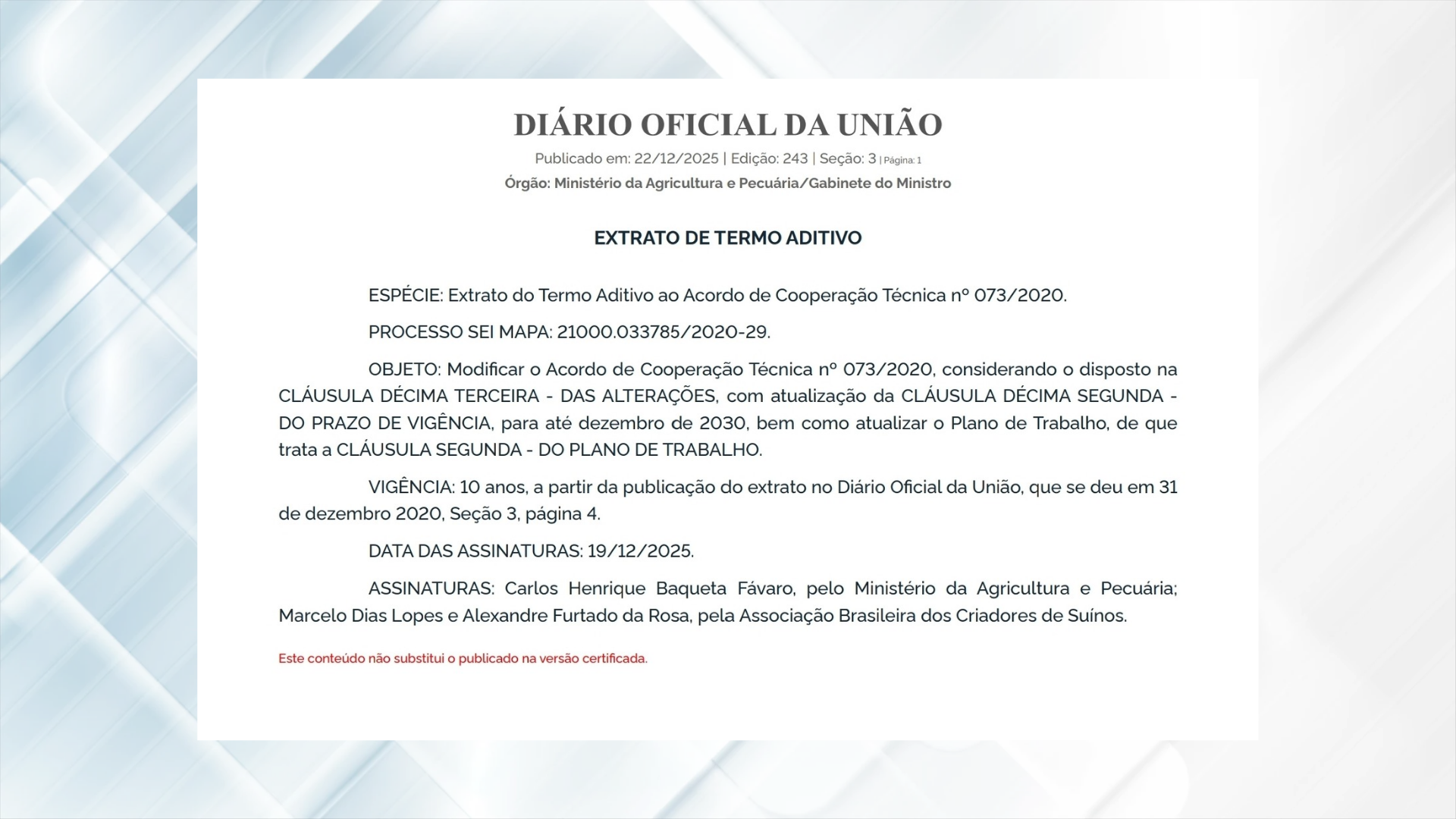 A Associação Brasileira das Empresas de Genética de Suínos (ABEGS) e a Associação Brasileira dos Criadores de Suínos (ABCS) firmaram, junto ao Ministério da Agricultura e Pecuária (MAPA), o Primeiro Termo Aditivo ao Acordo de Cooperação Técnica nº 073/2020, assegurando a manutenção, a modernização e a plena operacionalização da Estação Quarentenária de Cananeia (EQC) até dezembro de 2030.